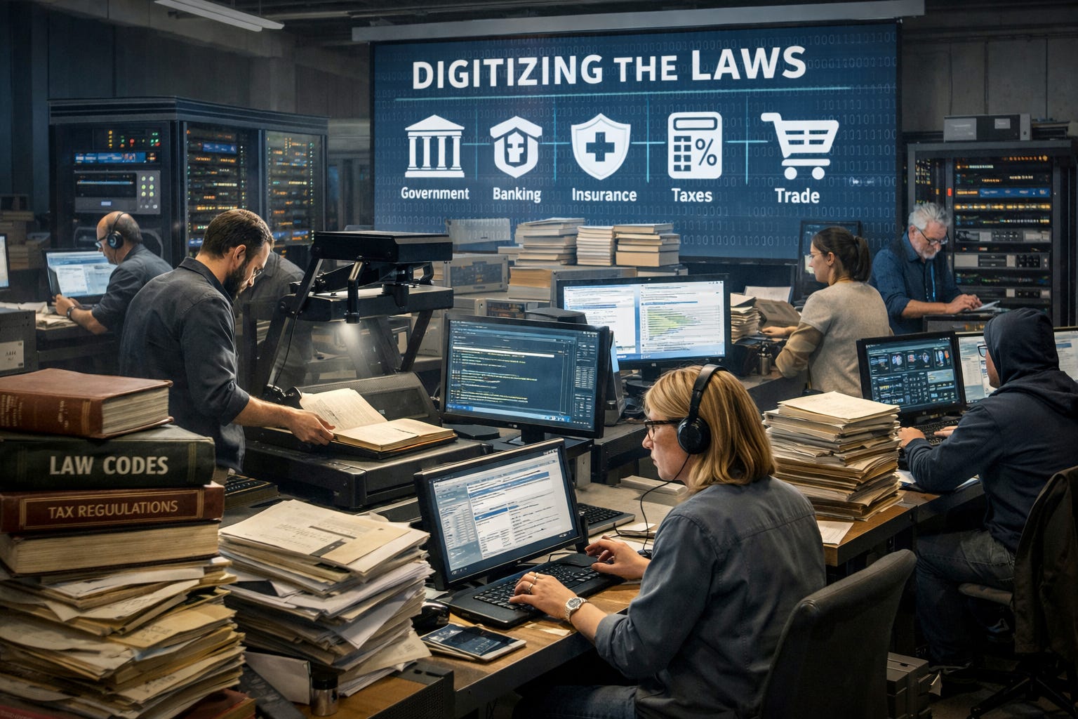 Fig. 1: This would be the scene for a few months or even years in all countries of the world: Reformulating all existing laws and procedures in all administrative units to a shared global standard. (generated with ChatGPT)